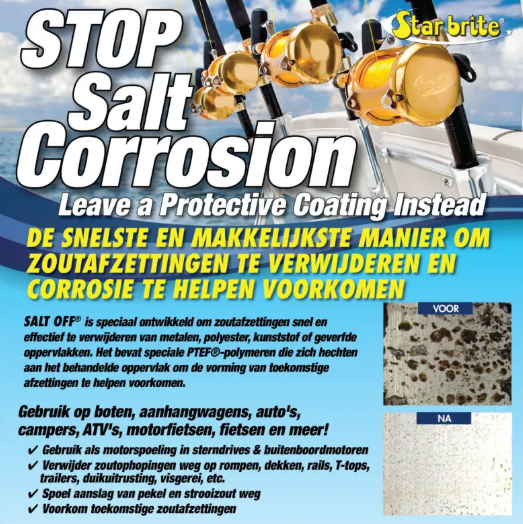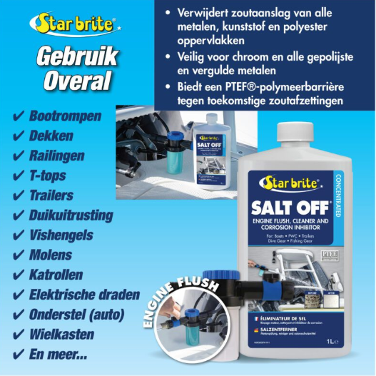Om zoutaanslag van externe bootoppervlakken, boottrailers, duikuitrusting, hengels en molens te verwijderen, vul de dispenserbeker van de Salt Off® Applicator met Salt Off® Zoutaanslag Verwijderaar – Concentraat. Bevestig het ene uiteinde van de applicator aan een tuinslang en het andere uiteinde aan een spuitstuk (let op: product bevat geen eventueel hiervoor benodigde adapters). Zorg ervoor dat de zwarte knop op de applicator in de positie “ON” staat en de blauwe knop in de positie “MIXTURE”. Besproei grondig alle te behandelen oppervlakken, zodat Salt Off® 5-10 minuten kan intrekken. Hardnekkige aanslag kan licht borstelen vereisen. Spoel met zoet water en laat behandelde oppervlakken opdrogen. Behandelen van voorwerpen door onderdompelen: 60-120 ml Salt Off® Zoutaanslag Verwijderaar – Concentraat op 4 liter zoetwater. Het te behandelen item enkele minuten onderdompelen. Daarna afspoelen met water en laten opdrogen. Voor het spoelen van binnen- en buitenboordmotoren: Vul de dispenserbeker met Salt Off® Zoutaanslag Verwijderaar – Concentraat. Bevestig het ene uiteinde van de applicator aan een tuinslang en het andere uiteinde aan een koppelingstuk die is ontworpen voor uw motortype (let op: product bevat geen eventueel hiervoor benodigde adapters). Zorg ervoor dat de zwarte knop op de applicator in de positie “ON” staat en de blauwe knop in de positie “WATER ONLY”. Laat de motor draaien om de normale bedrijfstemperatuur te bereiken. Zodra de bedrijfstemperatuur is bereikt, zet u de motor uit en draait u de blauwe knop naar “MIXTURE” en controleert u of de oplossing stroomt. Start de motor opnieuw en laat de motor lopen totdat de dispenserbeker helder is en het product op is. De polymeercoating van Salt Off® beschermt de motor tegen toekomstige roest en corrosie.